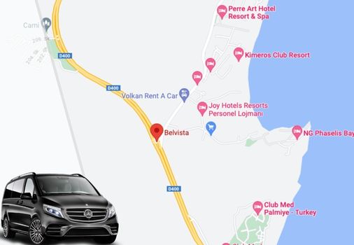 Belvista Hotel ulaşım ve buradan Antalya Havalimanına dönüş transferlerinizde 48 EUR57 $43 £2250 TL’den başlayan en uygun fiyatlar iyitransfer’de. Üstelik ihtiyaçlarınıza göre kişiselleştirebileceğiniz transfer seçenekleriyle! Firmamız, Antalya Havaalanı ile Belvista Hotel arası transferleriniz için 5 farklı araç seçeneğiyle hizmet veriyor. Antalya Havalimanı’ndan shuttle servis, özel taksi ve Vip transfer alternatiflerimizle Belvista Hotel ulaşımınızı sağlayabilirsiniz.